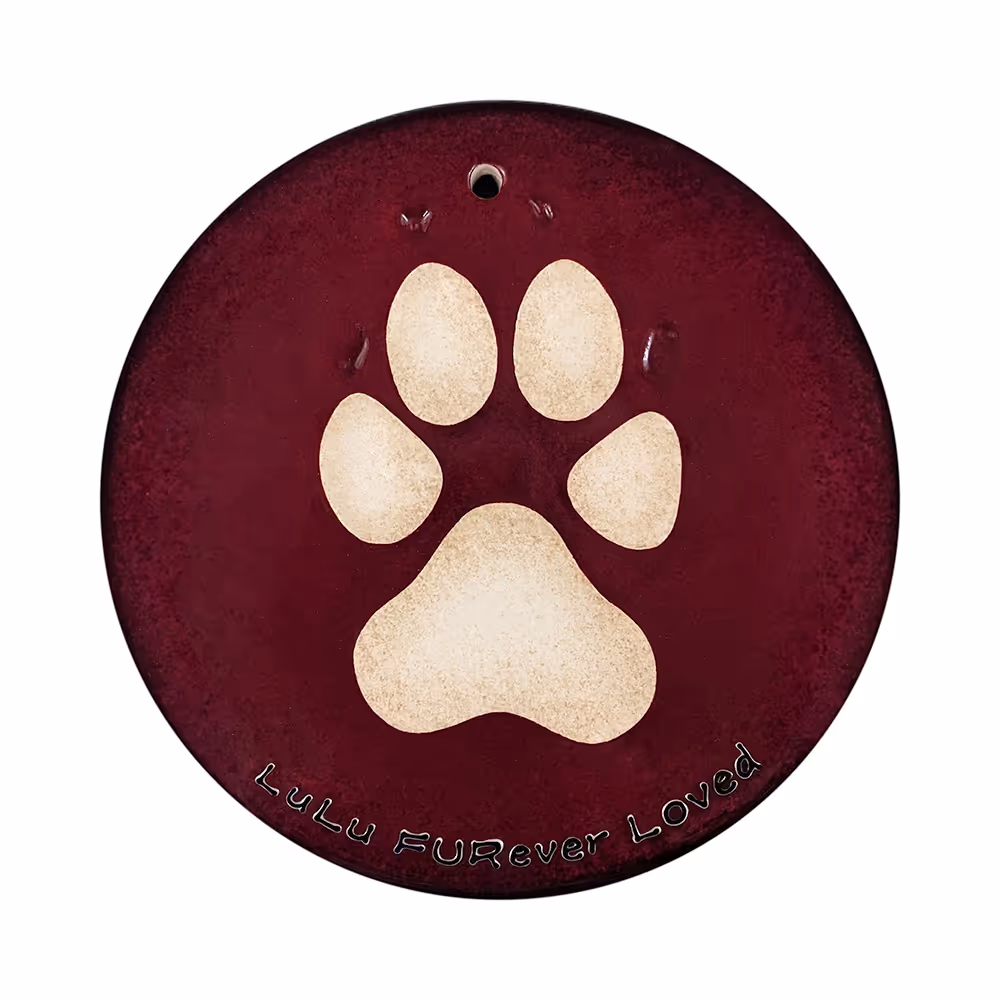 Close-up of a finished pet impression from Peartree Impressions, showcasing fine details and a flawless, kiln-fired finish.