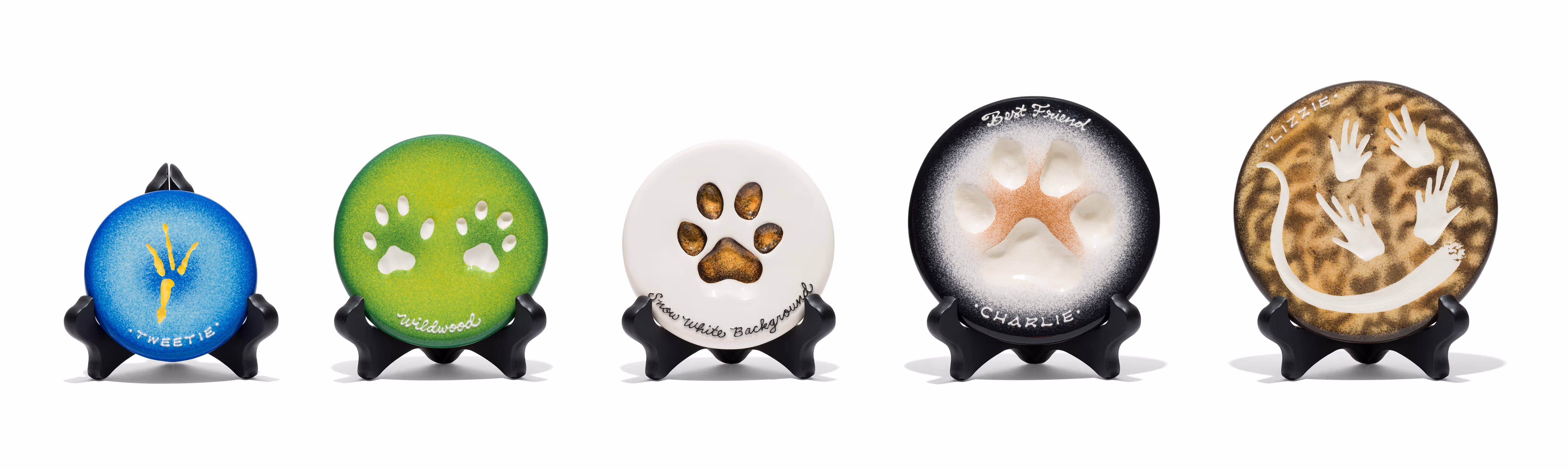 Whether you're looking for a simple option to preserve your pet’s imprint or a bespoke fur-matched impression with extra lettering, we've got you covered.
